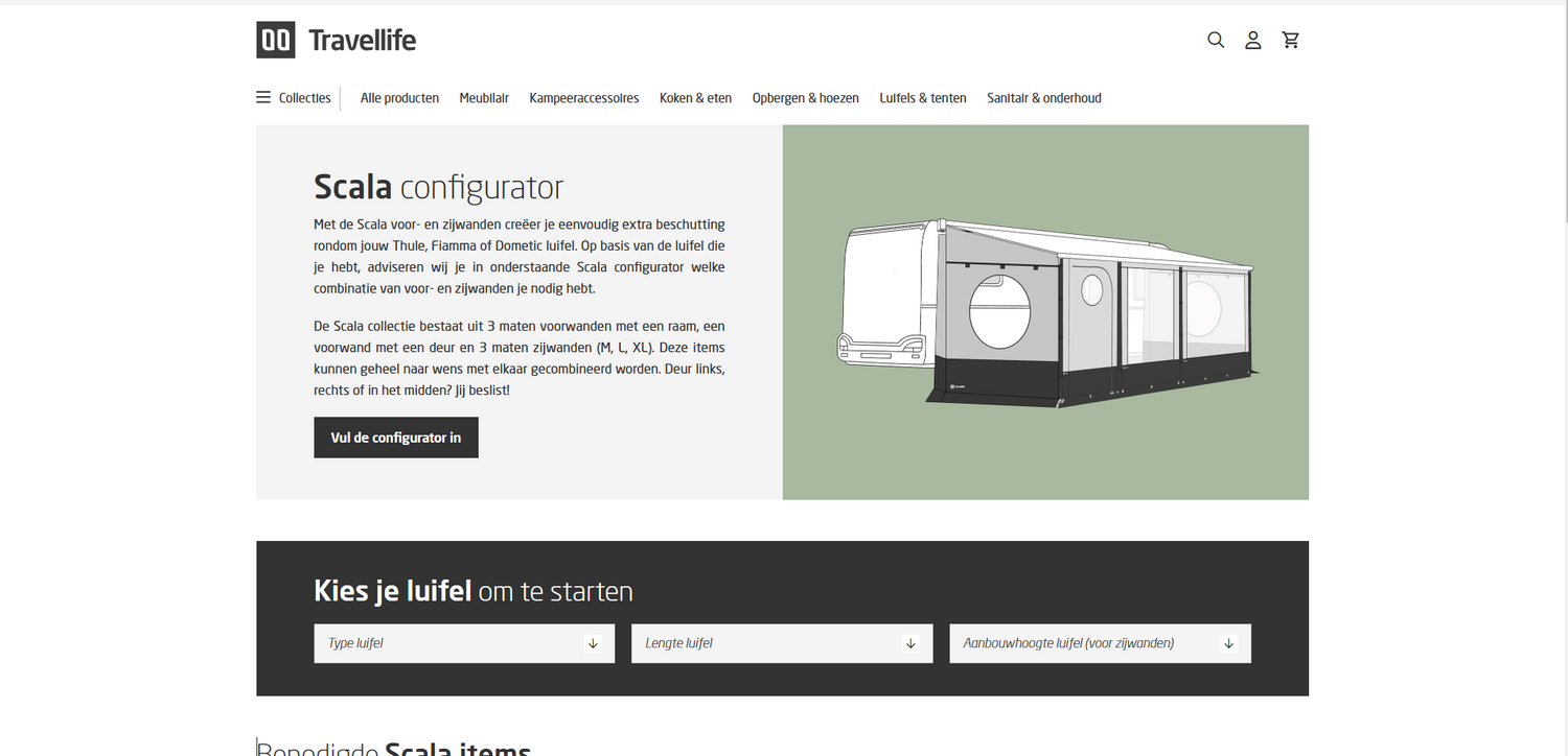 Geniet optimaal van je kampeerervaring met een luifel die perfect aansluit bij jouw caravan. De scala configurator helpt je bij het kiezen van de juiste combinatie van wanden, zodat je altijd beschikt over de benodigde schaduw en bescherming.